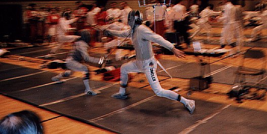 A week or two into my time with the Fencing Club, the Club was approached by the Varsity Fencing team’s coach, looking for anyone with fencing experience. I was one of the few who had fenced in high school, and I was offered a spot on the sabre squad immediately (they had only one sabre fencer, and needed at least three to make a complete squad).